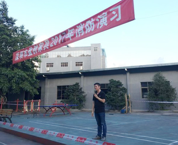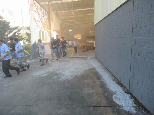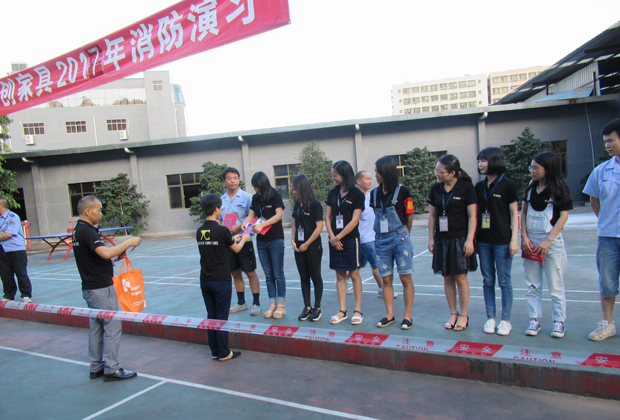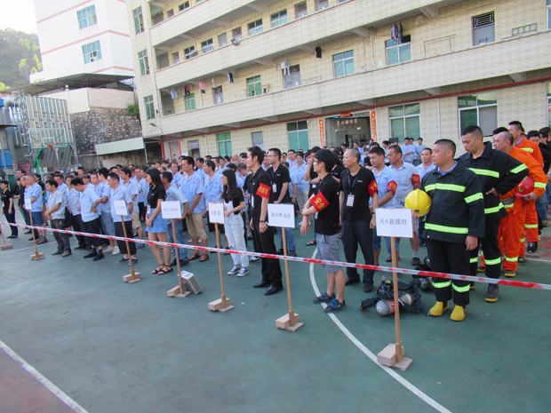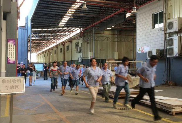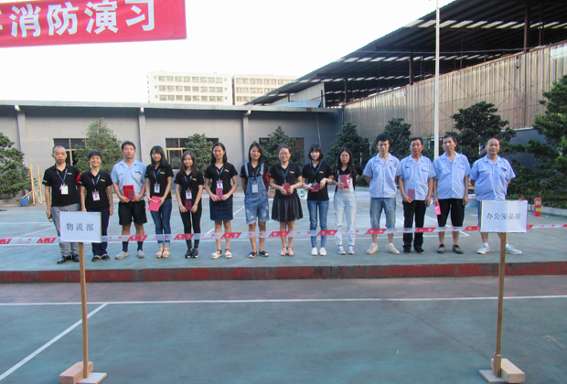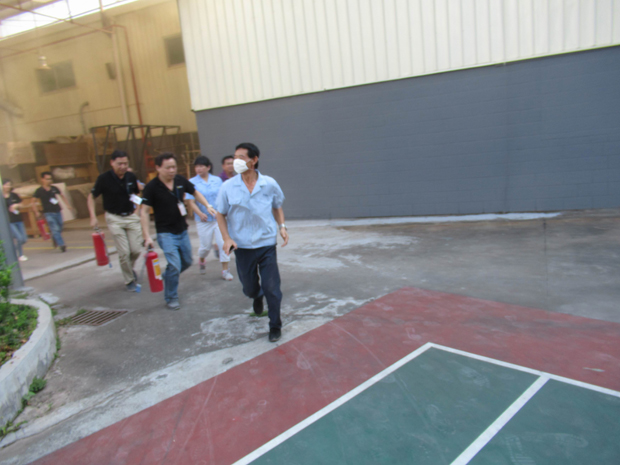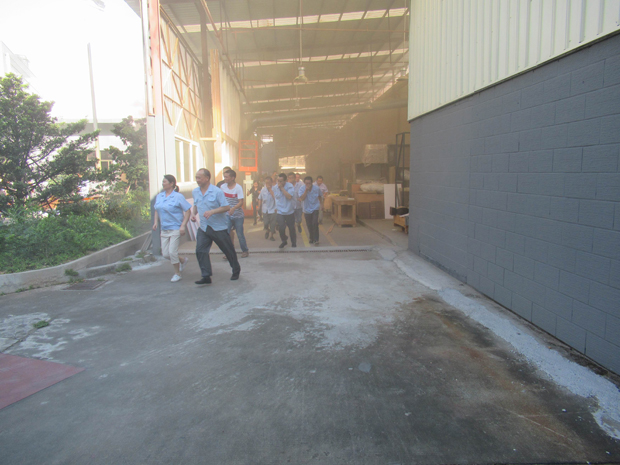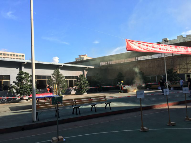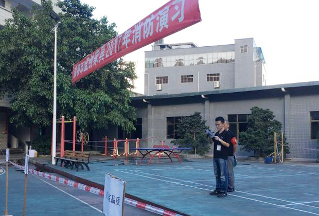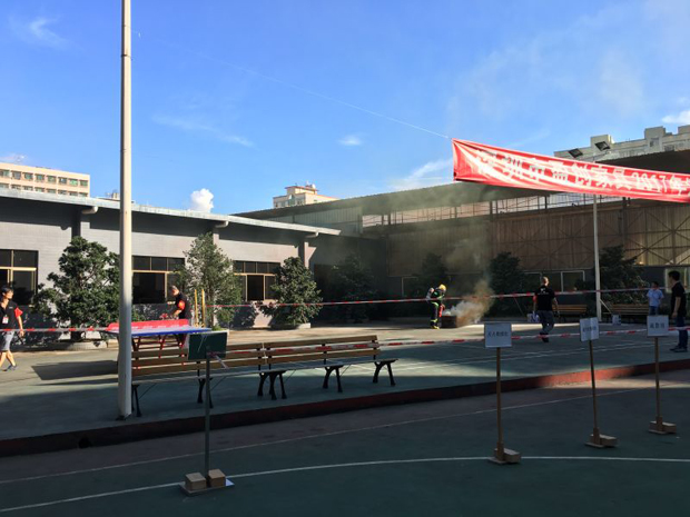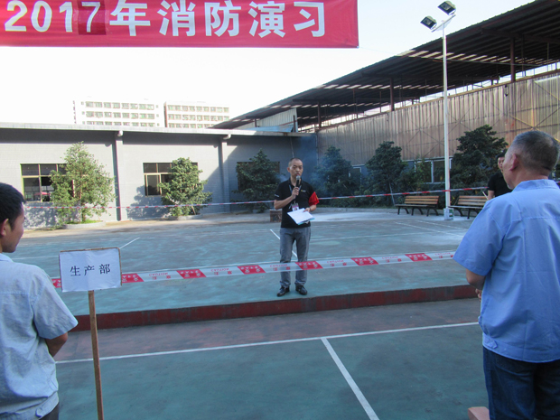 在2017年6月29日17:00分,總指揮下達(dá)了演練開(kāi)始,木工車間吸塵塔粉塵未及時(shí)清理產(chǎn)生火情,事故現(xiàn)場(chǎng)人員立即組成報(bào)警組發(fā)出火警報(bào)警信號(hào)。各演練工作組在聽(tīng)到指令后,迅速到位,參加演練的義務(wù)消防員和工作人員全部佩戴消防演習(xí)紅袖章,疏散組在最短的時(shí)間內(nèi),于車間內(nèi)、樓梯間及安全出口處,通過(guò)口令加手勢(shì),指揮員工從指定路線進(jìn)行有秩序地疏散;把現(xiàn)場(chǎng)所有人員,快捷有序地疏散到安全地帶(公司宿舍前籃球場(chǎng));滅火救援組第一組人員在一分鐘到達(dá)現(xiàn)場(chǎng)使用滅火器、消防栓進(jìn)行滅火,滅火二組在3分鐘內(nèi)穿著裝,佩戴空氣呼吸器到達(dá)現(xiàn)場(chǎng)進(jìn)行現(xiàn)場(chǎng)搜救及滅火救援;通訊警戒組按照人員分工,確保通訊、警戒、引導(dǎo)消防車輛、阻止無(wú)關(guān)人員進(jìn)入火場(chǎng),確保了救援行動(dòng)的正常進(jìn)行;救護(hù)保障組準(zhǔn)備了救護(hù)器材,對(duì)受傷人員及時(shí)救護(hù)及后勤保障。