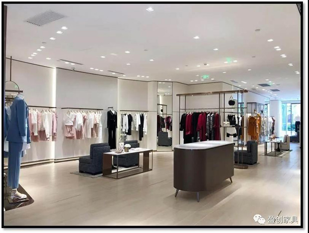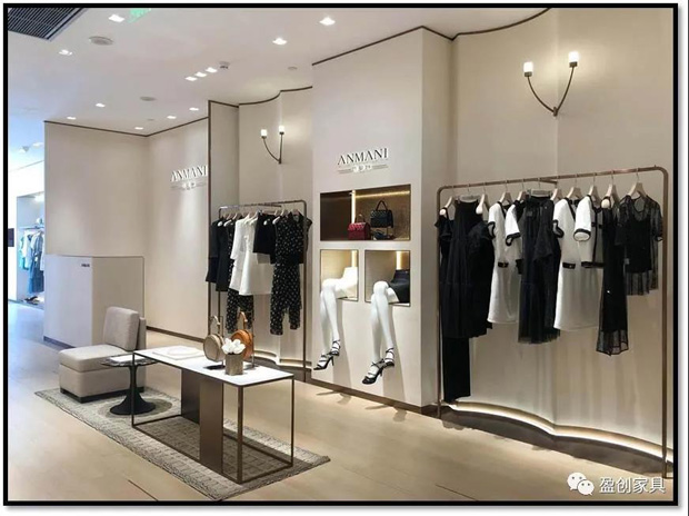 深圳市盈創(chuàng)家具有限公司,為高端服飾提供的,拉絲啞金掛衣架、墻面裝飾條、啞金發(fā)光字、啞金的包邊鏡子、彈簧門框、沙發(fā)、飾品展示臺等道具交付使用場景圖片。